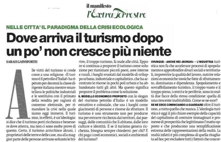 Nel nostro paese la narrazione del turismo “petrolio d’Italia” ha a lungo bloccato il dibattito sui danni del turismo. Oggi, tuttavia, il mito del turismo come volano di salvezza economica non regge più. E sempre più cittadini e cittadine denunciano le storture del sistema, che di fatto rende le destinazioni turistiche prodotti da consumare. La soluzione non è, come spesso si sente dire, un turismo di qualità. Ma la decrescita turistica.