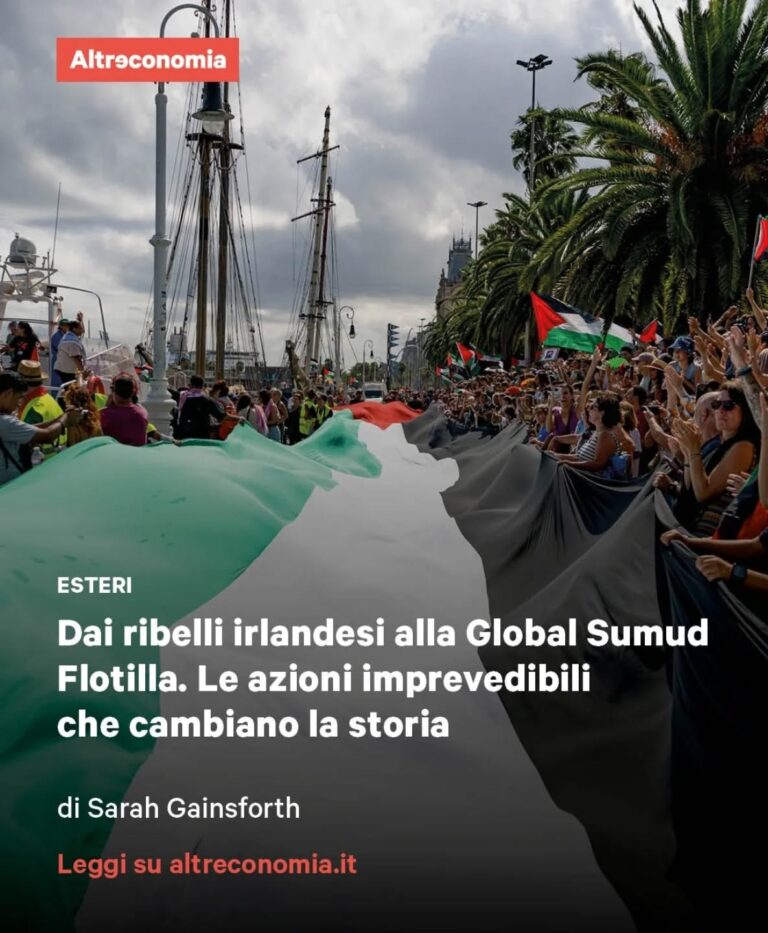 Sarah Gainsforth ripercorre due eventi che portarono all’indipendenza dell’Irlanda: l’occupazione dell’ufficio postale di Dublino e l’annessa declamazione. Quei gesti compiuti contro l’impero più oppressivo della storia dell’epoca potevano sembrare folli e irrazionali ma avevano un altro scopo: agire sul piano simbolico e suscitare una reazione, proprio come fanno oggi le navi in mare verso Gaza.