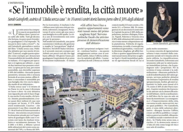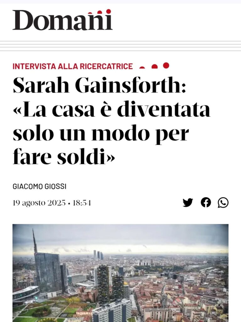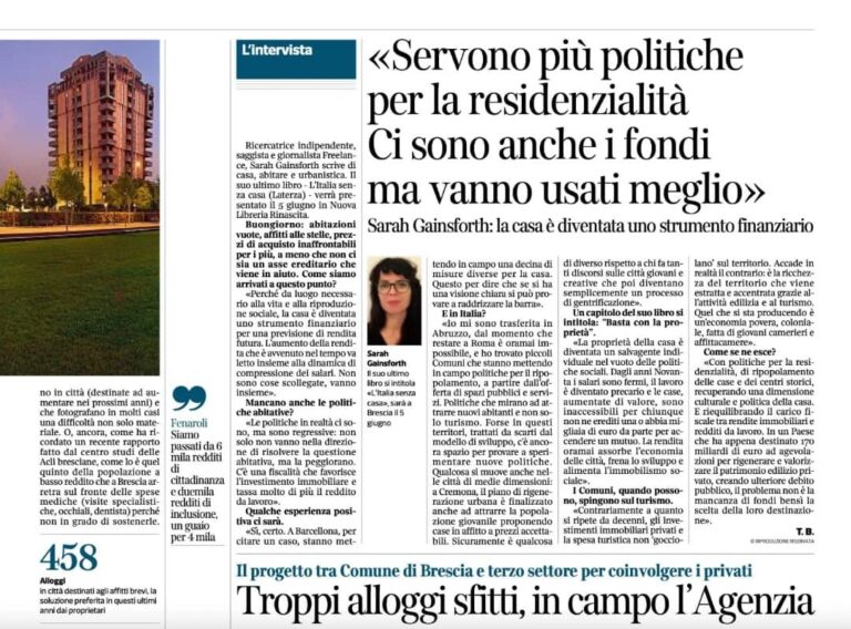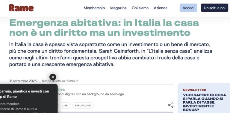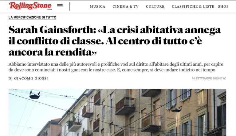 In Italia la casa è spesso vista soprattutto come un investimento o un bene di mercato, più che come un diritto fondamentale. Sarah Gainsforth, in “L’Italia senza casa”, analizza come negli ultimi trent’anni questa prospettiva abbia cambiato il ruolo della casa e portato a una crescente emergenza abitativa.