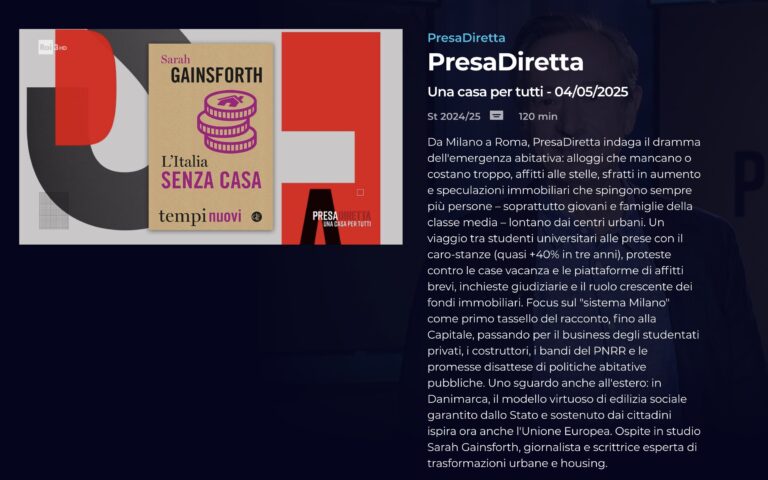 Nella puntata ‘Una casa per tutti’, il 4 maggio 2025, Presa Diretta ha raccontato l’emergenza abitativa in Italia, alimentata anche da un’offerta di stanze a prezzi molto alti in studentati privati pagati con i fondi del Pnrr. Ne ho parlato in studio, a partire dal mio L’Italia senza casa (Laterza, 2025).