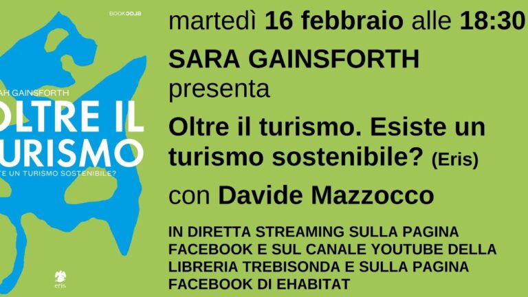 https://www.youtube.com/watch?v=A1fOQREJP3g Martedì 16 febbraio alle 18:30 Sarah Gainsforth presenta Oltre il turismo. Esiste un turismo sostenibile? (Eris) con Davide Mazzocco. Che si tratti di città d’arte, paradisi naturali, borghi di collina o piccoli siti archeologici, il turismo di massa innesca un processo che modifica l’ecosistema urbano e naturale, consumando e spesso cancellando le caratteristiche alla base dell’attrattività delle destinazioni turistiche.…