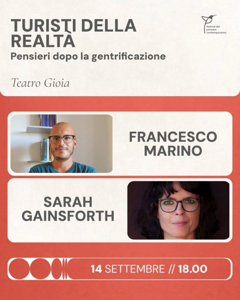 Se la gentrificazione svuota le città, la realtà diventa un palcoscenico. Ne ho parlato con Giulia Boero e Francesco Marino che nel suo Turisti del mondo (Tlon) indaga come i social e l’economia dell’attenzione hanno trasformato la nostra percezione del mondo, come siamo diventati spettatori distratti della nostra stessa vita, trasformando ogni esperienza in contenuto, consumabile e monetizzabile. Abbiamo ragionato…